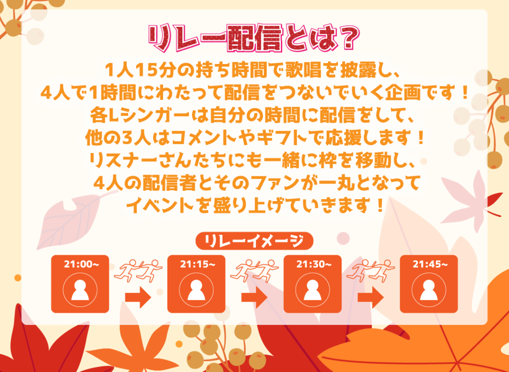 11月21日(金)21時スタート!リレー配信イベントVol.2開催決定🎤🌈完走者へプレゼントあり✨